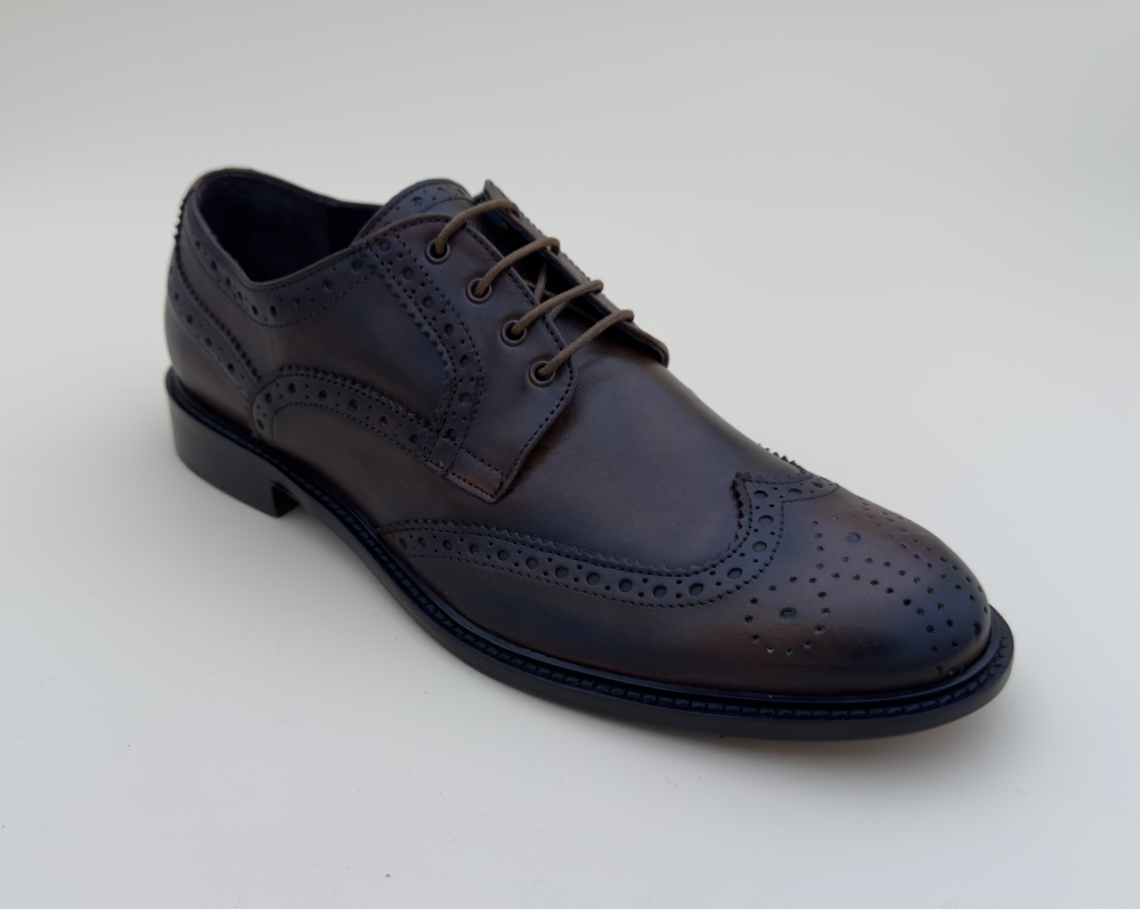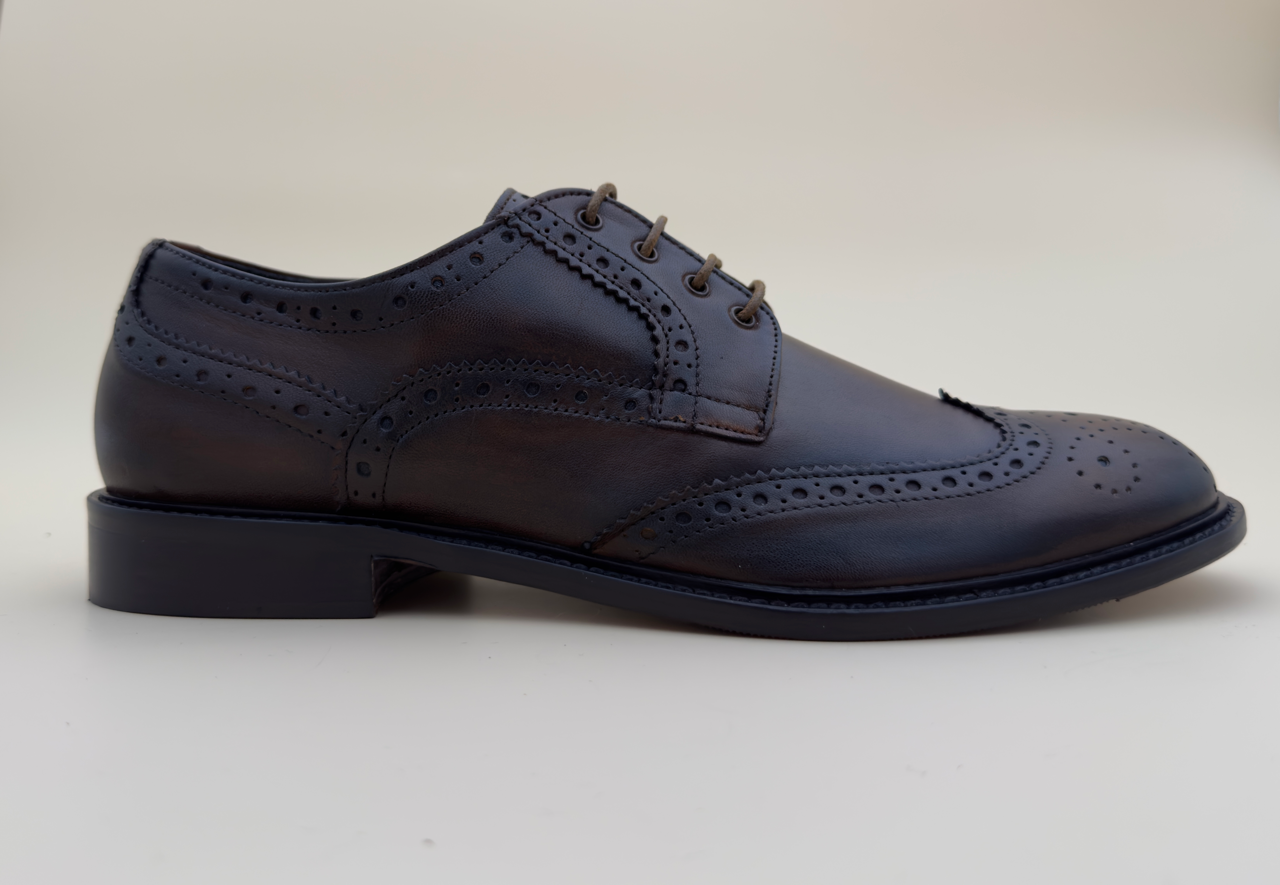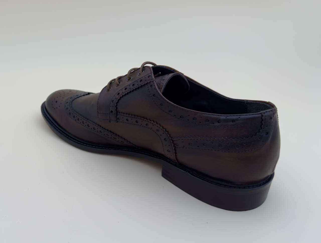Cuir de veau brun foncé, patine travaillée et perforations délicates.
