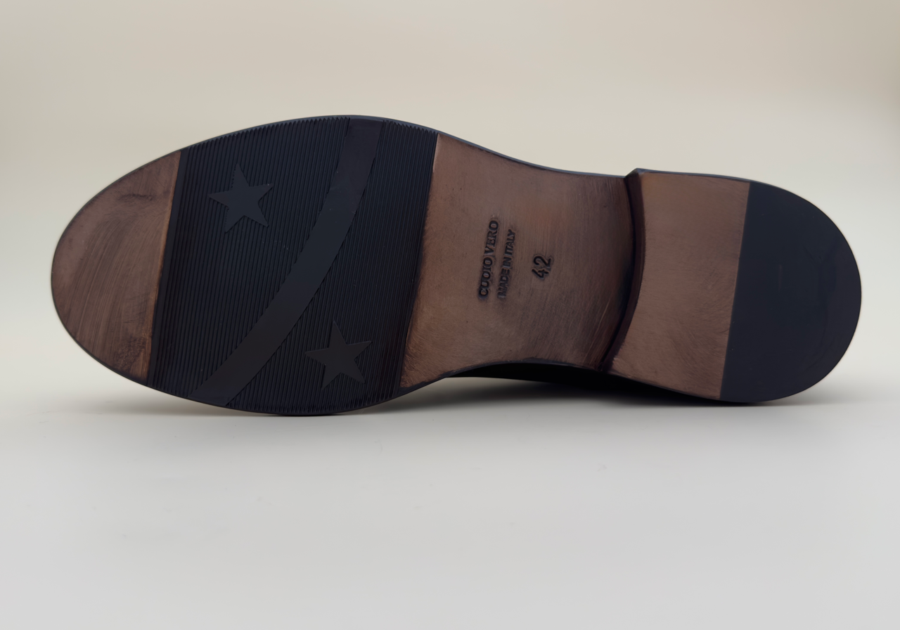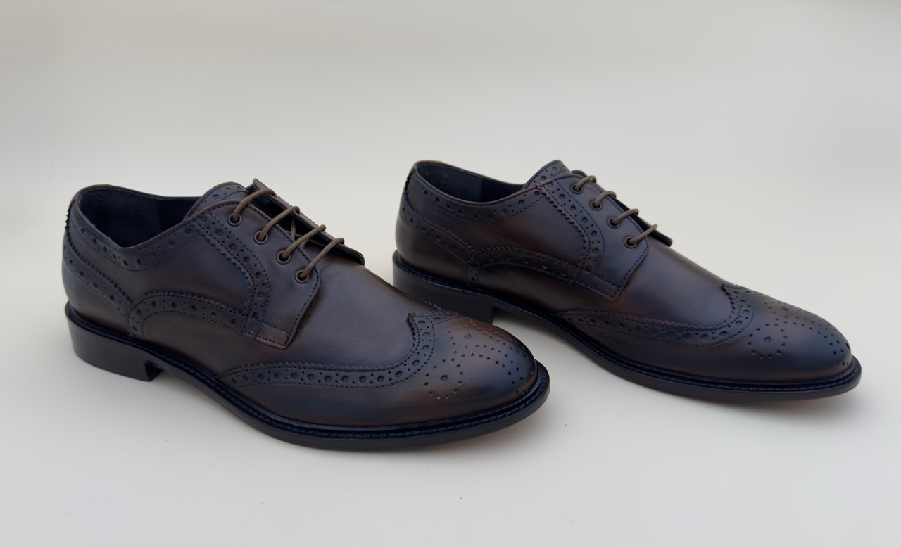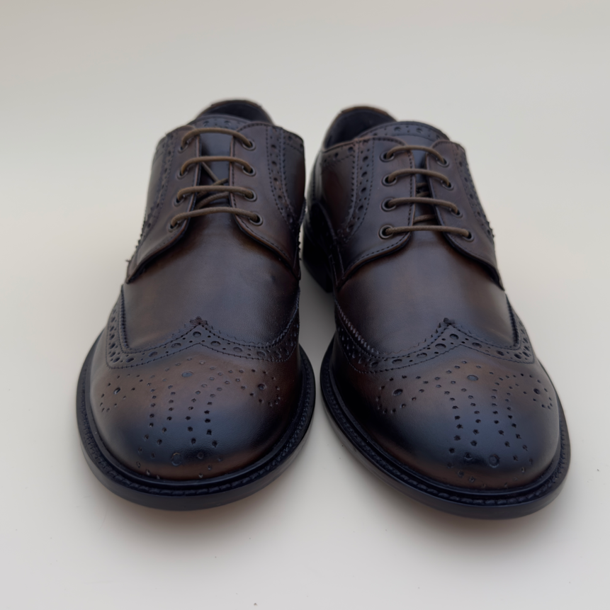 Cuir de veau brun foncé, patine travaillée et perforations délicates.