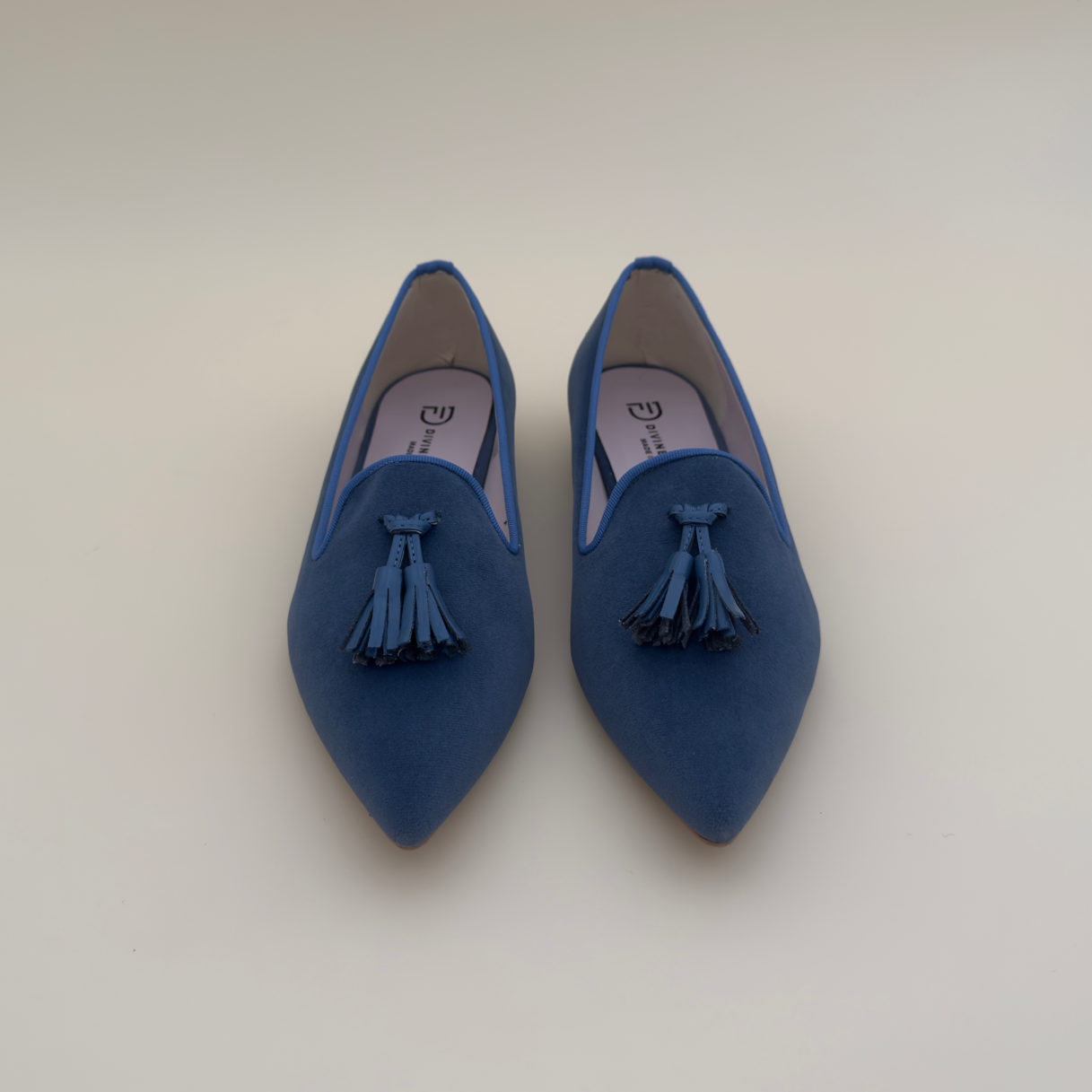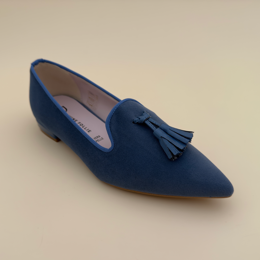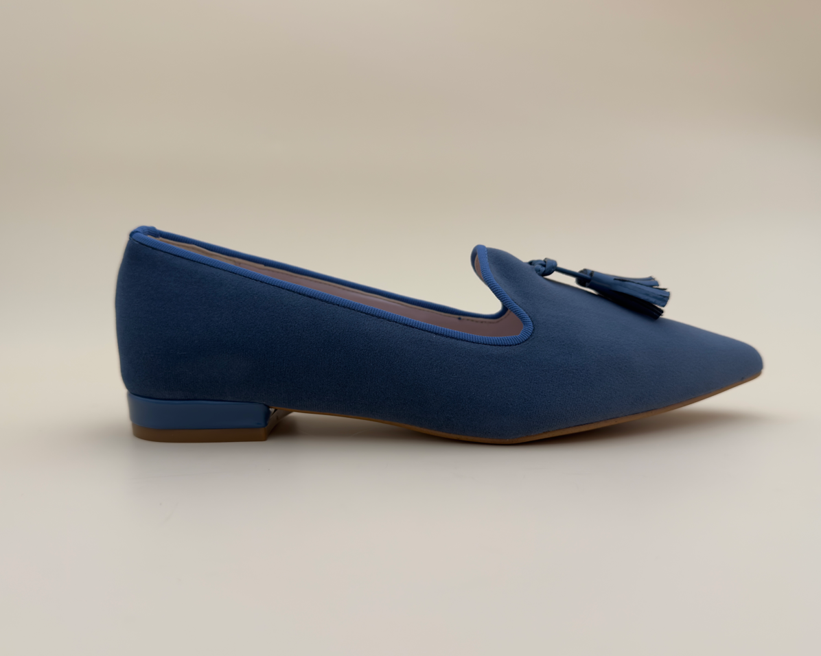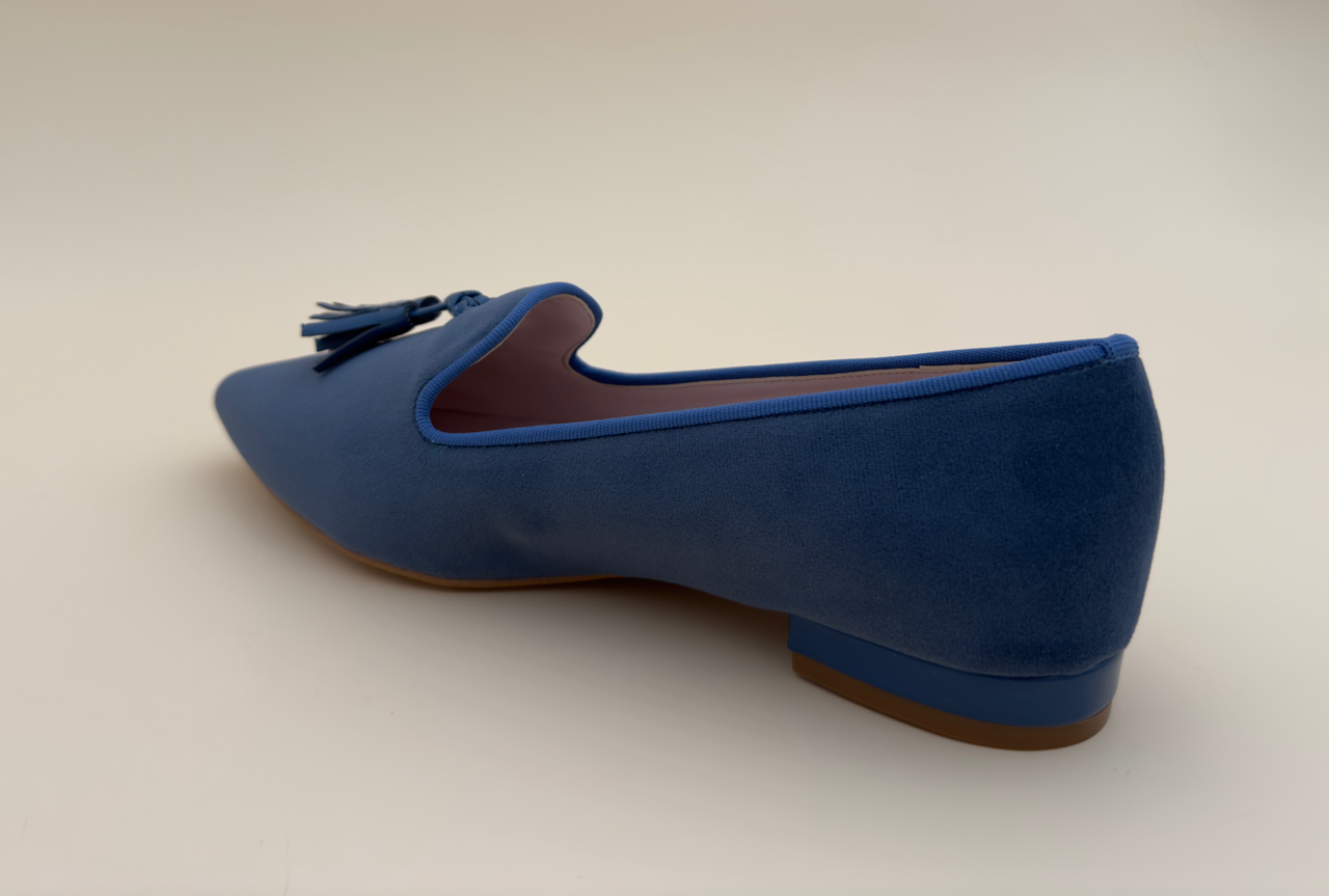 Velours fin à reflets profonds, travaillé sur une forme effilée au bout allongé. Les pampilles façonnées à la main et la bordure ton sur ton soulignent un savoir-faire précis, où la coupe épouse le pied sans contrainte. Un équilibre subtil entre souplesse et tenue.